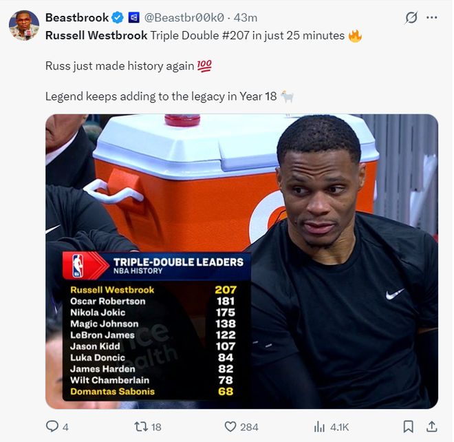 207次三双吞里程悲!底薪威少反超约基奇登顶 队记:感谢37岁老将